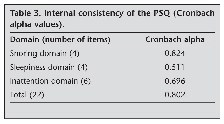 Total PSQ score ranged between 0 and 0.95 and mean score was 0.35 ? 0.22. Snoring score ranged between 0 and 1.25 and mean was 0.26 ? 0.36. Mean sleepiness and inattention domain scores were 0.26 ? 0.28 and 0.51 ? 0.36 respectively.