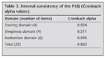 Cronbach?s alpha value for snoring domain was 0.824 (Table 3). Item scale correlations for snoring domain were significant for all items. Pearson?s correlation coefficient for item ?Does your child snore more than half the time?? was 0.86 while that of ?Does your child always snore? was 0.82. The items ?Does your child snore loudly? and ?Does your child have ?heavy? or loud breathing?? had correlation coefficients of 0.83 and 0.75 respectively.