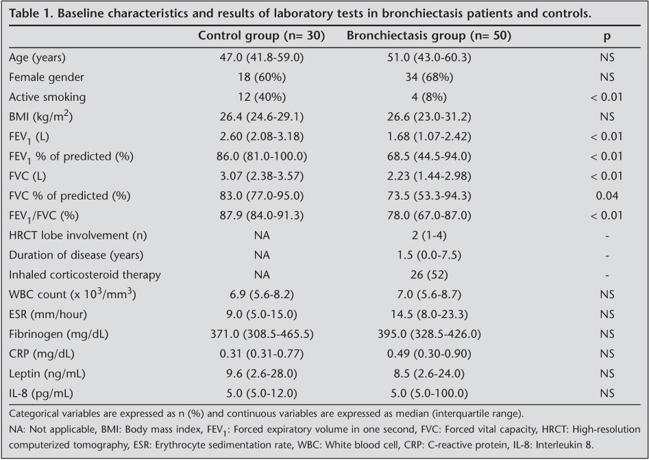 Previous studies have shown the presence of intense inflammatory activity characterized by neutrophils, T-cells and interleukin (IL)-8 positive cells and elevated levels of IL-6, IL-8, tumour necrosis factor (TNF)-α, leukotriene B4, endothelin 1, elestase in sputum and bronchoalveolar lavage samples of bronchiectasis patients (7,8,9,10,11,12). Recent evidence suggests the presence of systemic inflammation in chronic inflammatory airway diseases. Studies performed in patients with asthma and chronic obstructive pulmonary disease (COPD) have shown elevated levels of systemic inflammatory markers (13,14); however little is known regarding systemic inflammatory response in bronchiectasis (15).