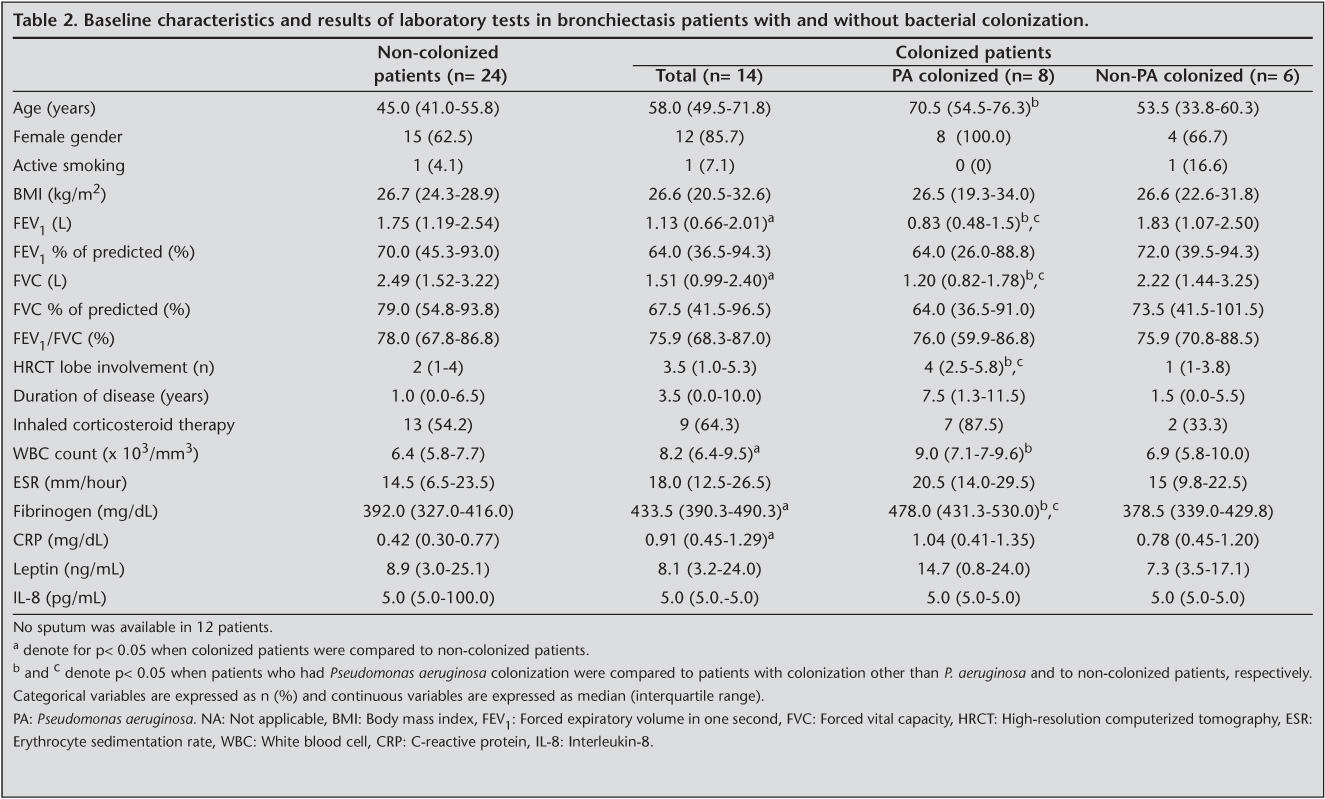 The association between systemic inflammation and disease severity is also supported by the findings observed in the P. aeruginosa group of this study. The most commonly accused microorganism with disease severity and worse clinical outcome in bronchiectasis is P. aeruginosa. The presence of this microorganism during stable period is related with more extensive disease, severe airflow limitation and rapid decline in lung function (20,22,23,24,25). Consistently, in this study, patients with P. aeruginosa colonization had more impairment in pulmonary function tests and more diffuse disease on HRCT. All inflammatory markers in the P. aeruginosa group were higher when compared to other groups; however these differences did not reach statistical significance except for WBC count and fibrinogen levels. We believe that the small number of patients has considerably contributed to the statistical non-significance in this subgroup analysis. Nonetheless, these findings point out to a potential role of colonization with certain microorganisms, particularly P. aeruginosa, in the initiation of low-grade systemic inflammation in bronchiectasis.