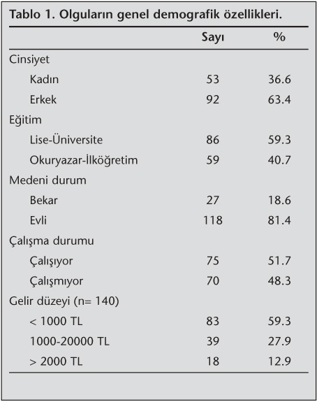?al??maya ya? ortalamas? 42.2 ? 11.7 (18-70) y?l olan 145 olgu dahil edildi. Olgular?n genel ?zellikleri Tablo 1'de g?r?lmektedir.