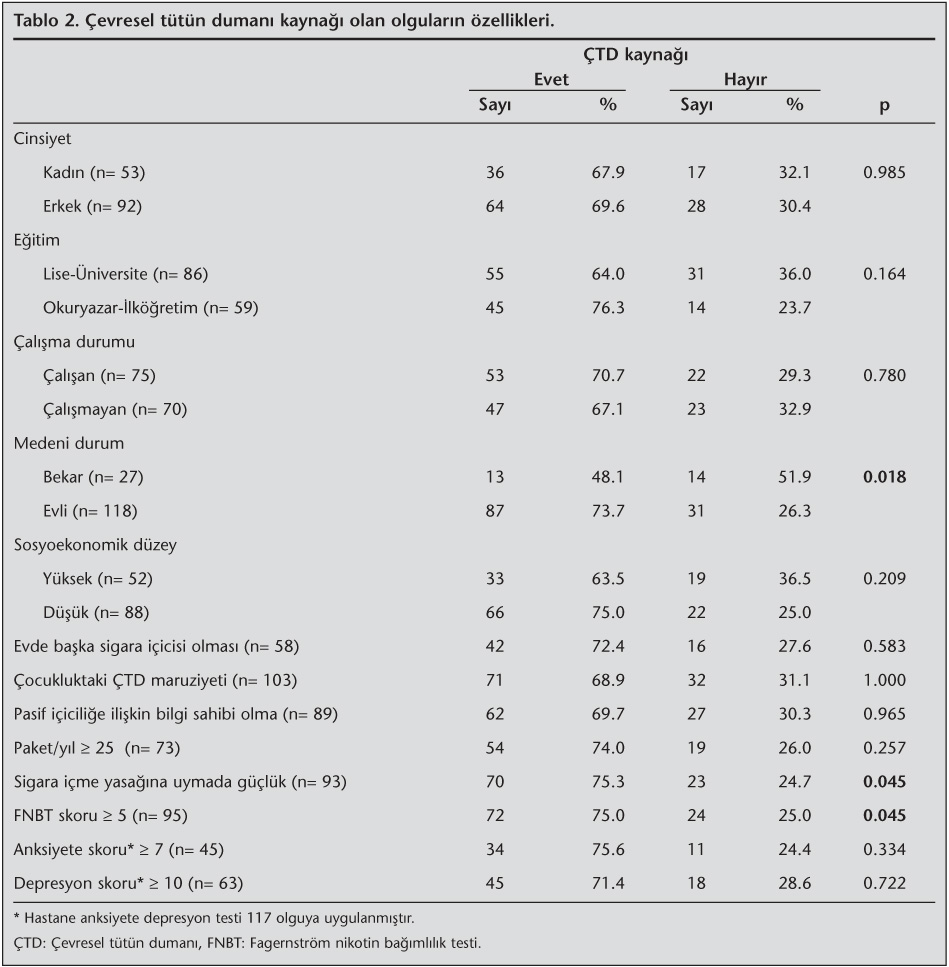 ?TD kayna?? olan (n= 100) ve olmayan olgular?n (n= 45) ya? ortalamalar? (42.4 ? 12.0 y?l ve 41.8 ? 11.4 y?l) benzerdi (p= 0.786). ?TD kayna?? olma ?zerine etkisi olabilece?i d???n?len ?e?itli fakt?rler Tablo 2 ve 3'te g?r?lmektedir. Evli olan olgular?n daha s?k olarak ?TD kayna?? oldu?u belirlenirken (p= 0.018), cinsiyet, e?itim ve ?al??ma durumu, sosyoekonomik d?zey, evde ba?ka sigara i?icisinin olmas?, ?ocukluk ?a??ndaki ?TD maruziyeti ve pasif sigara i?icili?ine ili?kin bilgi sahibi olman?n etkisi saptanmad? (Tablo 2).