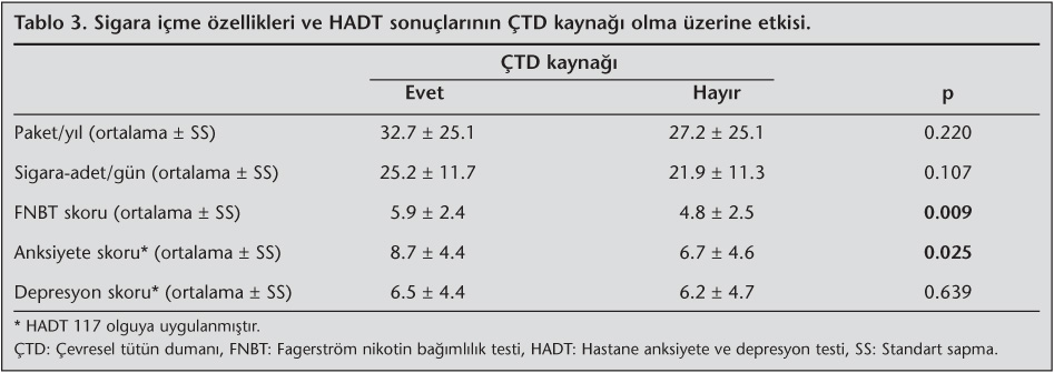 Sigara i?me ?zelliklerinden bir g?nde i?ilen sigara say?s? ve paket/y?l de?eri ile erken ya?ta (≤ 15 ya?) sigara i?meye ba?laman?n ?TD kayna?? olma ?zerine etkisi saptanmad? (p de?erleri s?ras?yla 0.107, 0.220 ve 0.650). ?TD kayna?? olan olgular olmayanlara g?re sigara i?me yasa??na uymada daha fazla oranda g??l?k ya??yorlard? (p= 0.045). T?m olgular?n ortalama FNBT skoru 5.6 ? 2.5 iken, ?TD kayna?? olanlarda 5.9 ? 2.4, olmayanlarda 4.8 ? 2.5 idi ve aradaki farkl?l?k anlaml? bulundu (p= 0.009). ?TD kayna?? olan 100 olgunun 72 (%72)'sinde FNBT skoru ≥ 5 iken, di?er 45 olgunun 24 (%53.3)'?nde FNBT skoru ≥ 5 idi ve aradaki farkl?l?k anlaml? idi (p= 0.045) (Tablo 2, 3).