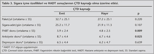 HADT uygulanan 117 olguda anksiyete skoru ortalamas? 8.1 ? 4.6 (0-19), depresyon skoru ortalamas? 6.5 ? 4.5 (0-19) idi. ?TD kayna?? olan olgularda olmayanlara g?re anksiyete skoru ortalamas? y?ksek bulundu (p= 0.025) (Tablo 3). K?rk be? olguda anksiyete ve 54 olguda depresyon ile ili?kili yak?nmalar?n oldu?u saptand?. ?TD kayna?? olma ?zerine anksiyete ve depresyon ile ili?kili yak?nmalar?n varl???n?n etkisi saptanmad? (s?ras?yla p de?erleri 0.334 ve 0.722) (Tablo 2, 3).