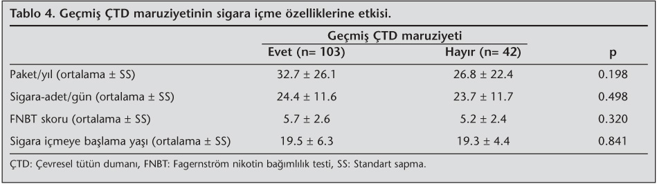 Olgular?n sigara i?me ?zelliklerine ?ocukluk d?nemindeki ?TD maruziyetinin etkisine ait sonu?lar Tablo 4'te g?r?lmektedir. ?TD maruziyeti ?yk?s? olan ve olmayan olgularda ortalama paket/y?l, g?nl?k sigara say?s?, sigara i?meye ba?lama ya?? ve FNBT skoru benzerdi.