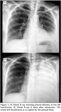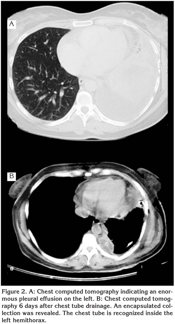A 35-year-old woman was admitted to our hospital due to an acute left chest pain, extending to the sternum, accompanied by shortness of breath. Her pulse rate was 115/min combined with blood pressure of 105/60 mmHg. The respiratory rate was 25/min, oxygen saturation 89-91% and the axilla temperature was measured 38.8?C. Physical examination revealed reduced respiratory whispering at the left basis. Chest X-ray showed pleural effusion on the left, while the needle thoracentesis performed, attributed clear, yellowish liquid (Figure 1A). Two days later, a new chest X-ray indicated rapid deterioration and the performed chest computed tomography scan revealed extensive pleural effusion on the left (Figure 1B, Figure 2A). A chest tube was inserted and 2.300 mL of clear, yellowish liquid were drained. Six days later, a new chest computed tomography scan showed encapsulated collection at the top of the left lung, while the fever insisted with axilla temperature climbing at 39.2?C (Figure 2B).