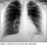 Within 48 hours her condition improved and her temperature returned to normal. Intravenous ampicillin was continued at the higher dose for 10 days and followed by one week of oral ampicillin, 2 g daily. The patient was discharged without any medication on the 18th postoperative day. Six weeks after admission her radiograph is clear, while she is asymptomatic (Figure 3).