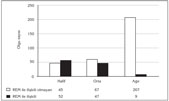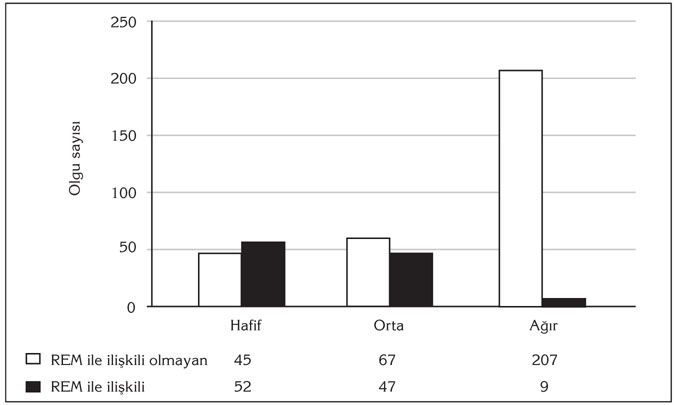 REM ile ili?kili grupta OSAS ?iddeti, REM ile ili?kili olmayan gruba g?re daha d???kt? (p< 0.0001). REM ile ili?kili grubun OSAS ?iddetine g?re da??l?m? s?ras?yla 52 olgu hafif (52/108= %48.14), 47 olgu orta (47/108= %43.52) ve 9 olgu a??r (9/108= %8.34) iken, REM ile ili?kili olmayan grupta 45 olgu hafif (45/319= %14.10), 67 olgu orta (67/319= %21) ve 207 olgu a??r (207/319= %64.9) idi (?ekil 1).