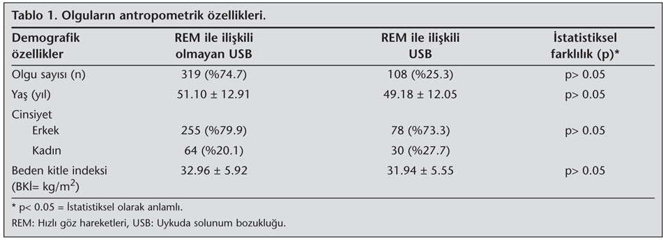 Erkeklerin kad?nlara oran? (erkek/kad?n) 3.5 olarak bulundu. Bu olgular?n 108 (%25.3)'i REM ile ili?kili OSAS, 319 (%74.7)'u ise REM ile ili?kisi olmayan OSAS olarak saptanm??t?r. REM ile ili?kili OSAS hastalar?n?n ya? da??l?m? 49.18 ? 12.05 y?l, REM ile ili?kili olmayan hastalar?n ise 51.10 ? 12.91 y?l idi. Gruplar aras?nda ya? da??l?m? a??s?ndan istatistiksel farkl?l?k (p= 1.75) saptanmad?. Her iki grubun cinsiyet da??l?m?na bak?ld???nda da gruplar aras? farkl?l?k (p= 0.095) yoktu. Her iki grubu olu?turan bireylerin beden kitle indeksleri (REM ile ili?kili olmayan grupta 32.96 ? 5.92 kg/m2, REM ile ili?kili grupta 31.94 ? 5.55 kg/m2) aras?nda da anlaml? farkl?l?k (p= 0.116) yoktu (Tablo 1).