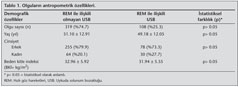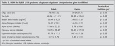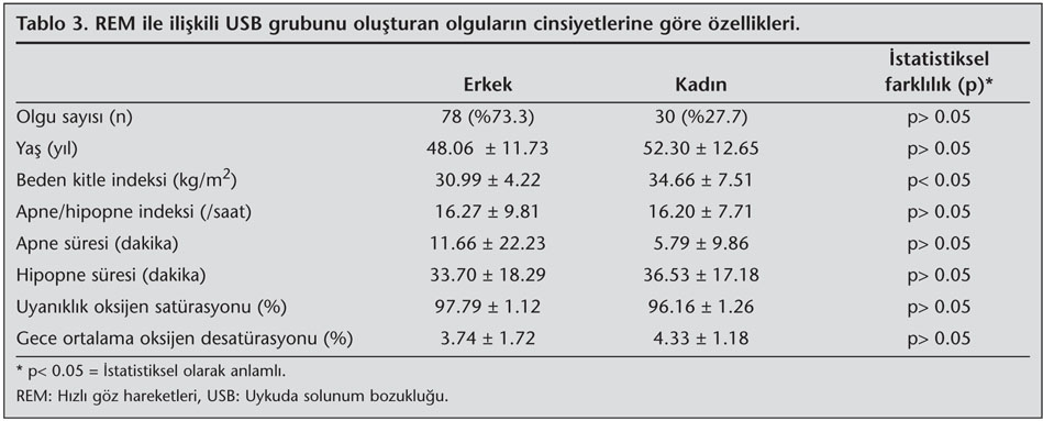 REM ile ili?kili grubun cinsiyetlere g?re alt grup analizi yap?ld???nda ise, grubu olu?turan bireylerin 78 (%73.3)'inin erkek, 30 (%27.7)'unun kad?n oldu?u g?r?ld?. Erkek ve kad?n olgular?n ?zelliklerine bak?ld???nda ya?, AH?, uyan?kl?k oksijen sat?rasyonlar? ile gece ortalama oksijen desat?rasyon de?erleri aras?nda anlaml? farkl?l?k g?r?lmedi. Ancak REM ile ili?kili grubun kad?n cinsiyetini ta??yan bireylerde erkek bireylere g?re beden kitle indeksinin daha y?ksek oldu?u (34.66 ? 7.51 kg/m2'ye kar?? 30.99 ? 4.22 kg/m2, p= 0.002) saptand?. Gece kaydedilen en d???k oksijen sat?rasyonu de?eri ise kad?n grubunda daha d???kt? (%83.83 ? 5.39'a kar?? %86.52 ? 5.24, p< 0.02) (Tablo 3).