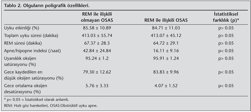 Gruplarda kaydedilen en d???k oksijen sat?rasyonu (REM ile ili?kili olmayan grup %79.30 ? 12.62, REM ile ili?kili grup %83.83 ? 9.96, p= 0.001) ile gece boyunca ortaya ??kan ortalama oksijen desat?rasyon de?erleri (REM ile ili?kili olmayan grup %5.76 ? 3.33, REM ile ili?kili grup %4.07 ? 1.52, p< 0.0001) ise REM ile ili?kili olmayan grupta anlaml? olarak daha d???kt?. Her iki olgu grubunun uyan?kl?k oksijen sat?rasyon de?erleri (%95.24 ? 1.2'ye kar?? %95.91 ? 1.24) aras?nda ise farkl?l?k (p= 0.895) saptanmad? (Tablo 2).