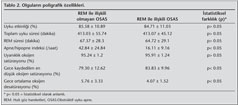 REM ile ili?kili OSAS ve REM ile ili?kisiz OSAS olgular?n?n g?nd?z a??r? uykululu?u Epworth uykululuk skalas? kullan?larak kar??la?t?r?ld???nda (7.8 ? 2.2'ye kar?? 8.6 ? 1.4) her iki grup aras?nda anlaml? istatistiksel farkl?l?k (p= 0.715) saptanmam??t?r.