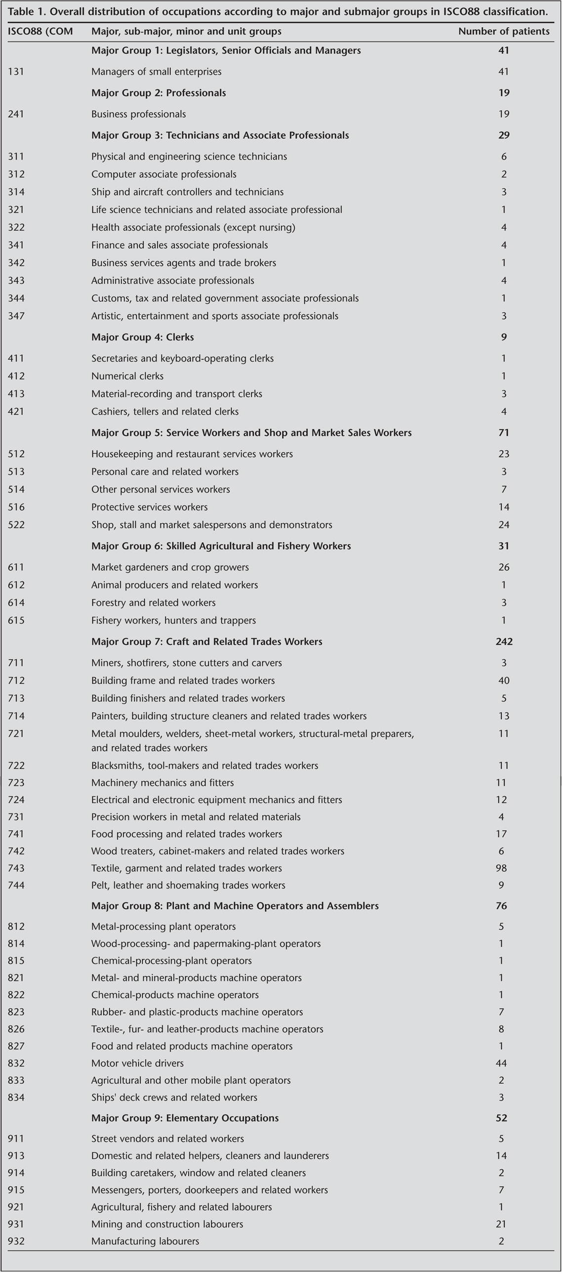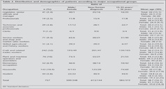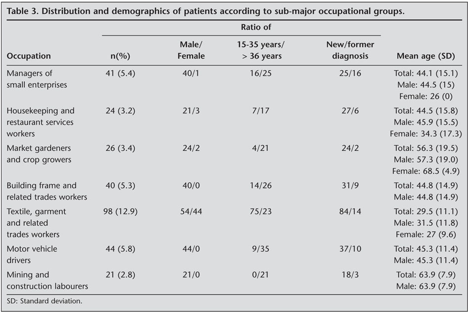 The youngest subgroup among the most popular subgroups was "textile, garment and related trades workers" [mean age (SD): 29.5 (11.1) years]. In the other subgroups, the percentage of patients over 35 years of age was higher than younger patients (Table 3).