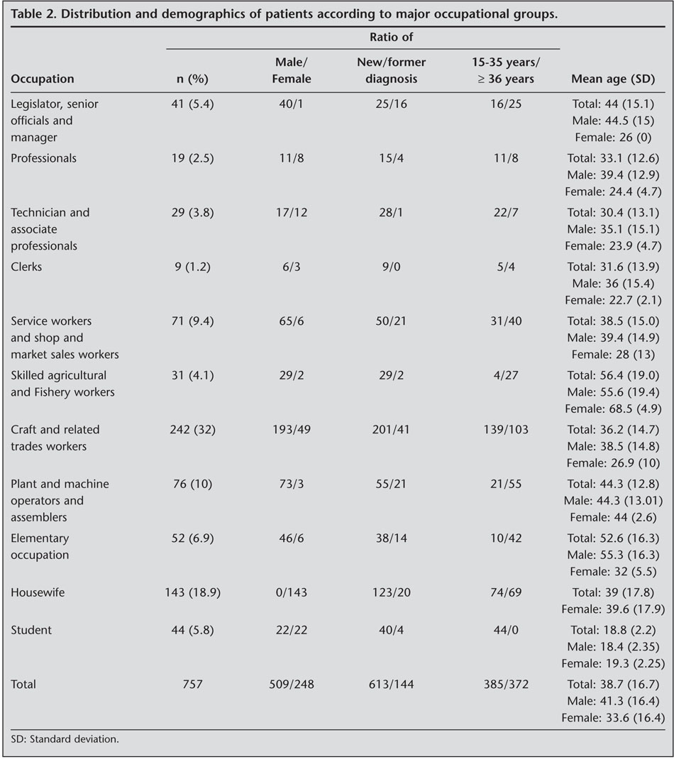 Results: Males composed 67% of the overall population [mean age (SD) was 41.3 (16.4) years]. Recurrent and newly diagnosed tuberculosis patients composed 81 and 19% of the patients, respectively. The most frequently identified major occupational groups were; craft and related workers (32%), plant and machine operators and assembler (10%), followed by the subgroups of textile, garment and related trades workers (12.9%), motor vehicle drivers (5.8%). The youngest subgroup among the most popular subgroups with a mean age (SD) of 29.5 (11.1) years, was textile, garment and related trades workers while the subgroup of mining and construction laborers was the oldest with a mean age (SD) of 63.9 (7.9) years. In all occupational subgroups, the frequency of males was higher than females. In female patients, the most frequently identified subgroup was, textile, garment and related trades workers while, mining and construction laborers, motor vehicle drives, building frame and related trades workers were composed solely of males. The frequency of newly diagnosed patients was significantly higher than former tuberculosis patients in the occupational subgroups.
