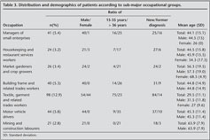 The subgroups including oldest patients were "mining and construction laborers" [mean age (SD): 63.9 (7.9) years] and "market gardeners and crop growers" [mean age: (SD) 56.3 (19.5) years] (Table 3).