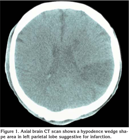 Urine analysis revealed a three plus glucose, the specific gravity was 1030 and three plus keton bodies. Chest X-ray was normal on admission. The computed tomographic (CT) study of brain, which was admitted on admission revealed a wedge shape hypo-dense area in the left parietal lobe without midline shift or hemorrhage, compatible with cerebral infarction (Figure 1).
