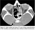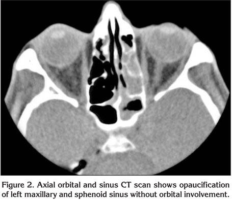 Upon consultation with ophthalmologist and otolaryngologist a CT scan of the orbit and para-nasal sinuses was obtained which revealed opacification of left maxillary and ethmoid sinus without orbital involvement (Figure 2).