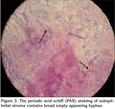 Histopathologic evaluation of resected tissue showed fragments of ciliated respiratory epithelium with underlying stroma, composed of congested and thrombosed dilated vessels and a piece of necrotic tissue plus hemorrhage. The periodic acid schiff (PAS) staining of subepithelial stroma contains broad empty appearing hyphea that are often twisted and collapsed with variable width. These hyphea characteristics are suggestive of mucormycosis (Figure 3).