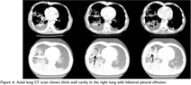 Bronchoscopy was normal and chest CT scan revealed a large thick wall cavity in right middle lobe with nodular and irregular inner borders suggestive of invasive necrotizing pneumonia (Figure 4).