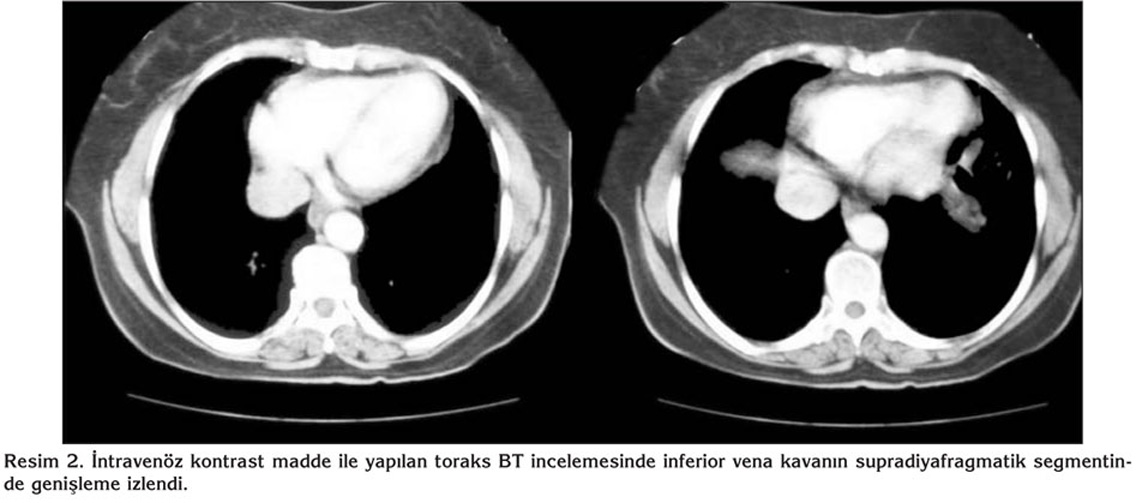 Elli sekiz ya??nda kad?n hasta, tekrarlayan ?ks?r?k ?ikayetiyle hastanemize ba?vurdu. Hasta ev han?m? idi ve sigara kullanm?yordu. ?yk?s?nde uzun s?redir nonprod?ktif ?ks?r?k ?ikayetine ek olarak s?k bo?az temizleme hissi ve bo?az a?r?s? mevcuttu. ?la? kullan?m ?yk?s? yoktu. Fizik muayenesi ve solunum fonksiyon testleri normal s?n?rlarda idi. Radyolojik tetkiklerinde; PA akci?er grafisi normal s?n?rlarda olan hastan?n waters grafisinde sa? maksiller sin?zit ile uyumlu bulgular? ve kontrastl? toraks bilgisayarl? tomografisi (BT)'nde diyafragma ?zerinde, sa? atriyum posterior kom?ulu?unda, ?VK'da anevrizmal geni?leme saptand? (Resim 1, 2). Yap?lan venografi incelemesiyle torasik ?VK segmentinde sakk?ler anevrizmal dilatasyon varl??? teyit edildi (Resim 3).