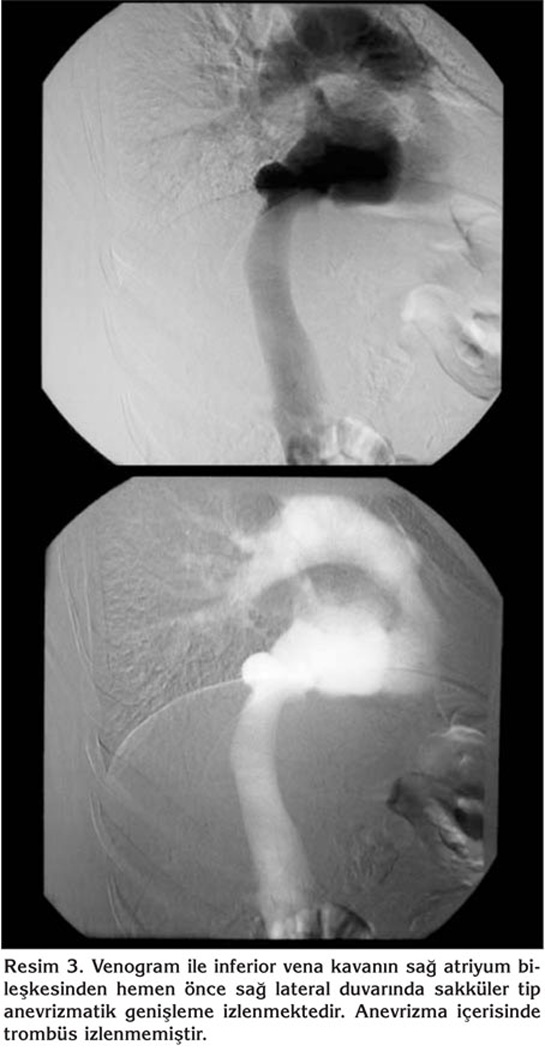 ?VK anevrizmalar? ?o?unlukla asemptomatik olup, hastalarda kar?n a?r?s?, gastrointestinal sistem kanamas?, akut ven?z okl?zyon, pulmoner emboli ve ?l?m g?r?lebilir (2,3). Bizim hastam?zda asemptomatik ?VK anevrizmas? tesad?fen saptanm??t?r. ?VK anevrizmas?n?n tan?s?ndan genellikle ba?ka nedenler i?in yap?lan ara?t?rmalar s?ras?nda saptanan fizik muayene ve radyolojik g?r?nt?leme y?ntemleri bulgular?yla ??phelenilir. Akci?er grafisi, BT, Dupleks renkli doppler ultrasonografi, manyetik rezonans anjiyografi ve konvansiyonel venografi gibi g?r?nt?leme y?ntemleri tan?n?n do?rulanmas?nda kullan?labilir (5). BT ile ?VK'n?n normal boyutu infrahepatik segment i?in 2.7 ? 1.5-3.7 cm iken, kardiyak segment i?in 2.39 ? 0.5 cm'dir (1,9). Bizim olgumuzda da BT ile saptanan suprahepatik anevrizman?n boyutu, 3.3 x 4 x 3 cm idi ve tan? venografiyle do?ruland?.