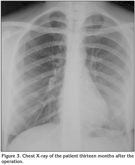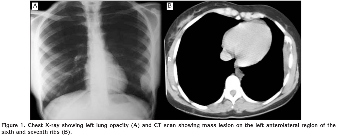 A 28-year-old woman presented with pain on her left side for three months. On physical examination, pain was present with palpation on the left side of chest wall and lung sounds were normal. Laboratory examinations were unremarkable. Postero-anterior chest X-ray showed opacity on the left sixth and seventh ribs. The patient admitted to our clinic with thorax computed tomography (CT) and PET/CT (positron emission tomography/computed tomography). CT of the thorax revealed an ill-defined destructive mass on the left anterolateral region of the sixth and seventh ribs (Figure 1). PET with 18 F-FDG depicted the lesion as a low grade malign neoplasm (SUVmax: 4.5) without any metastasis. We thought that the lesion was malignant according to the clinical and radiological findings. Because of the pain, we did not prefer taking biopsy under local anesthesia; we did it under general anesthesia. We studied frozen from the soft parts of the tissue which was taken with incisional biopsy. It was reported as malignant mesenchymal tumor or osteosarcoma. She underwent left posterolateral thoracotomy and a moderate swelling through the inside of left hemithorax originated especially from the sixth rib was detected. The sixth and the seventh ribs were enblock resected. Histopathological examination revealed the neoplastic cells that were uniformly small with diffuse growing pattern. These cells were strongly stained with focal SMA (smooth muscle actin) areas with vimentin. Tumor cells were negative for CD45, CD99, CD33 and CD56. Also chromogranin, pancreatin, EMA, TTF-1 were all negative. In addition to these findings, the most important component was osteoid production especially on the invaded regions (Figure 2). According to these clinical and histopathological findings the case was reported as primary SCO of the ribs. She was discharged on the 7th day of operation without any complication and referred to the medical oncology unit for chemotherapy. She was healthy and disease-free on the 17th month of follow-up (Figure 3).