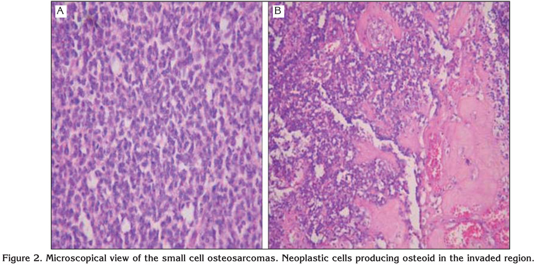 Histopathological investigations play important role in the diagnosis and distinguishing this rare tumor from the others with small round cell. Because, SCO resembles Ewing's sarcoma, however, osteoid production is the special characteristic to exlude from Ewing's sarcoma (4). Besides, soft tissue mineralization is that of periostal new bone formation which is characteristically laminated. This is in contrast to the mineralized to the tumor matrix seen in the soft tissue or intramedullary compartment with osteosarcoma (4). Given the frequent occurence of a large group of the tumors with small round cells, immunohistochemistry is crucial and should be interpreted in the differential diagnosis as well as the demographic and clinical features. In our case, we exluded Ewing's sarcoma with CD99 negativity; lymphoma with CD45; small cell lung cancer with CD56, chromogranin, pancreatin, EMA and TTF-1 negativity; rabdomyosarcoma with CD33, S100 and desmin negativity. Besides, pathognomonically, the tumor had the component of osteoid formation especially on the invaded regions. A final evaluation in the light of the above mentioned findings ascertained the definite diagnosis of SCO.