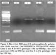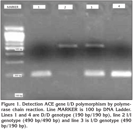 Blood samples were obtained in EDTA tubes both from the patients and controls. DNA was isolated according to the Dr. Zeydanl? (DZ) DNA isolation kit procedure and then stored at -20?C. The ACE gene I/D polymorphism was determined using the polymerase chain reaction (PCR) method. The primers used to determine ACE I/D polymorphism were F: 5'-CTG GAG ACC ACT CCC ATC CTT TCT 3' and R: 5' GAT GTG GCC ATC ACA TTC GTC AGA T-3', and the D/D genotype insertion area specific primer: F: 5'-TGG GAC CAC AGC GCC CGC CCG CCA CTA C-3' and R: 5'-TCG CCA GCC CTC CCA TGC CCA TAA-3'. To prevent incorrect D/D genotyping in samples of ACE D/D genotype, the results were confirmed with a second PCR analysis. PCR conditions were as follows: after the first denaturation for 5 min at 94?C, denaturation continued for 1 min at 94?C, which continued with 35 cycles of annealing for 1 min at 57?C (for verification of D/D genotype, at 63?C), and extension for 1 min at 72?C, which ended with final extension for 10 min at 72?C (13).