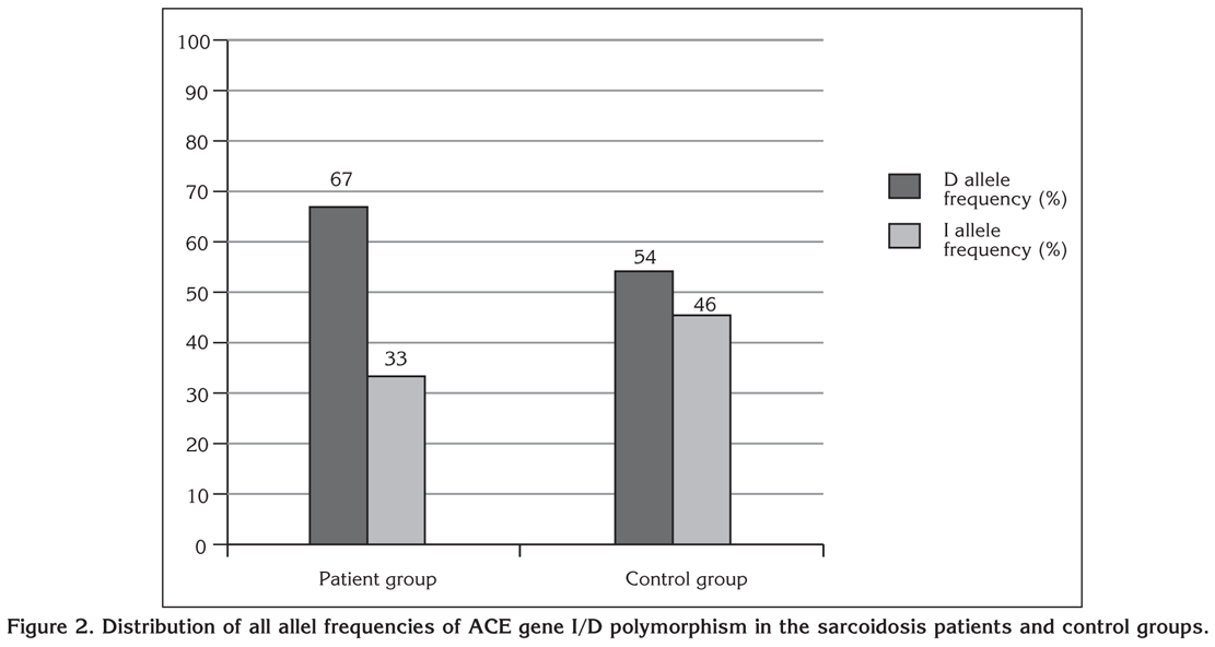 Results: Although the D allele was more frequent in the sarcoidosis patients group, the frequency of the D allele was 67% and 54% respectively in the sarcoidosis and the control group. No significant difference in allele frequencies of I/I, I/D, D/D polymorphisms was observed between the sarcoidosis and control group (p> 0.05). Similarly allele frequencies of I/I, I/D, D/D polymorphisms was not different between sarcoidosis patients with extrapulmonary involvement and sarcoidosis patients without extrapulmonary involvement (p> 0.05).