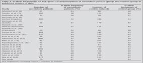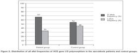 One of the possible mechanisms is functional polymorphism of the angiotensin converting enzyme (ACE) gene. The ACE gene, located on chromosome 17q23, contains many polymorphisms. The insertion/deletion (I/D) polymorphism in intron 16 is the most studied polymorphism (4). The genotype is classified into three types: deletion homozygotes (D/D), insertion homozygotes (I/I) and heterozygotes (I/D). Serum ACE levels corresponding to ACE I/D genotypes in the order I/I < I/D < D/D encouraged investigating the influence of this variation on sarcoidosis susceptibility (5,6). Some studies have not found association between ACE I/D polymorphism and the incidence of sarcoidosis (4,7,8,9). By contrast D/D genotype conferred a threefold increased in risk for sarcoidosis in African-Americans though lack of association between ACE gene polymorphism and sarcoidosis in Caucasians in the same study (10). Also D allele is a possible risk factor for development of sarcoidosis in Japanese women (11). Additionally a striking over-representation of the D/D genotype in sarcoidosis patients and in unaffected relatives has established in Germans (12).