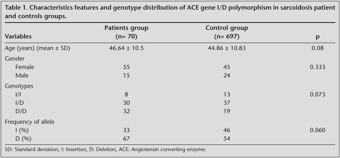 Conclusion: Our findings have showed that contribution of ACE gene polymorphisms to susceptibility of disease development in Turkish sarcoidosis patients is not different from the healthy control subjects.