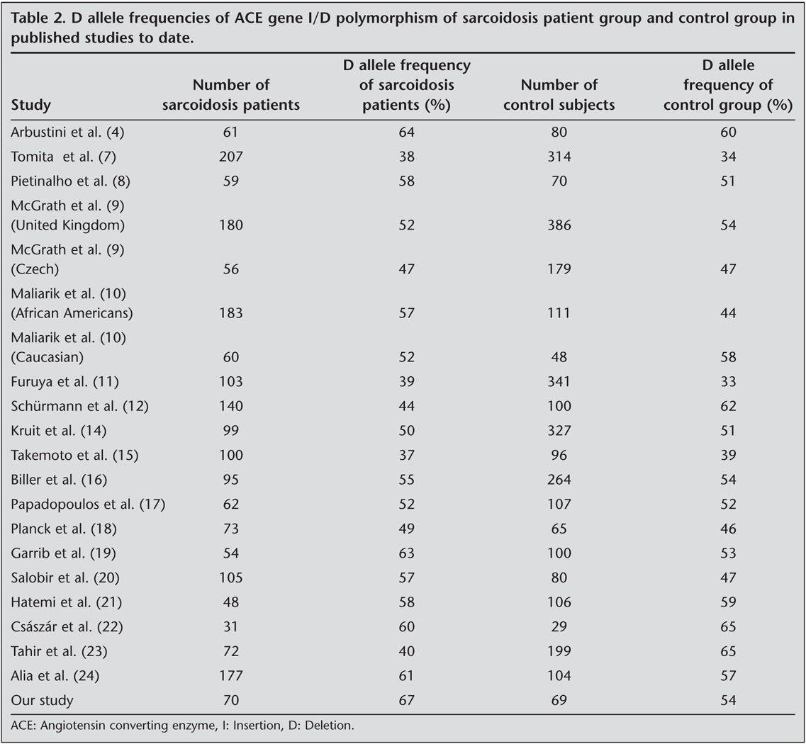Many studies have investigated the relationship between ACE gene I/D polymorphism and sarcoidosis to date. As a result these studies have showed that frequency of genotypes can be different according to the population (4,7,8,9,10,11,12,14,15,16,17,18,19,20,21,22,23,24). While Biller et al. studied ACE gene I/D polymorphism in Caucasian sarcoidosis patients from Northern Germany, Tomita et al. studied patients from Japan (7,16). In both reports, distribution of ACE genotypes of patients with sarcoidosis and healthy controls were not different. Similar results were found among United Kingdom, Czech, Scandinavian and Caucasian sarcoidosis patients in Sweden (9,17,18). Arbustini et al. analyzed ACE genotyping of Italian Caucasian population and Garrib et al. analyzed the genotyping of Caucasian patients in United Kingdom (4,19). In the both studies, D/D was the most frequent genotype observed but this difference did not attain statistical significance. Similarly, Pietinalho et al. analyzed ACE gene I/D polymorphism in Finnish population (8). Although the frequency of the D allele was higher in control subjects and sarcoidosis patients, the difference was not statistically significant. However, Furuya et al. found an over-represantation of the allele D in Japanese sarcoidosis patients as compared with Japanese control (11). While this phenomenon was significant in female, there was no clear difference in male patients. Maliarik et al. studied African Americans and Caucasians (10). There was not significant difference in the distribution of ACE I/D genotypes in Caucasian cases and controls. But they found a three fold increase in sarcoidosis risk in African Americans with the D/D genotype. Additionally in the former population D/D genotype showed a marked increase in risk for cases with a positive family history compared with those who had a negative family history. Sch?rmann et al. studied German families with more than one member suffering from sarcoidosis (12). There was a striking over-representation of the D/D genotype in patients with sarcoidosis and their families compared to controls. Also Salobir et al. evaluated Slovenian sarcoidosis patients (20). In the sarcoidosis patient group a higher frequency of the D allele was detected, while in the control group the D allele frequency was lower. So ACE gene I/D polymorphism in Slovenian sarcoidosis patients, an increased risk of the disease susceptibility was demonstrated in homozygous carriers of the D allele. Hatemi et al. studied the ACE I/D gene polymorphism in 48 Turkish sarcoidosis patients (21). As a result frequency distribution was not different in patients and healthy control subjects. Frequency of D allele in our study was higher compared to Hatemi et al. (67% and 58%, respectively) (21). Additionally the number of sarcoidosis patients was much higher (70 and 48 respectively).