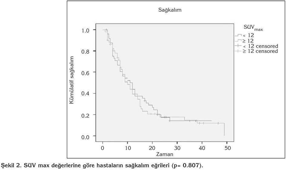 ?ki grubun sa?kal?mlar? kar??la?t?r?ld?. SUV max < 12 olan 50 hastan?n medyan sa?kal?m? 10.5 ay (1.5- 43.5), SUV max ≥ 12 olan 51 hastan?n medyan sa?kal?m? 8 ay (1-49) idi. Aralar?nda istatistiksel olarak anlaml? bir fark yoktu (p= 0.807) (?ekil 2).