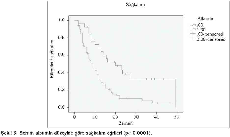 KHDAK'l? hastalarda da y?ksek serum LDH d?zeyinin k?t? prognostik fakt?r oldu?unu g?steren ?al??malar mevcuttur (29). Bizim ?al??mam?zda LDH d?zeyi 300 IU/L'nin ?zerinde olan olgularda sa?kal?m ortalamas? 10 ay, 300 ve alt?nda olanlarda ise 14 ay olarak saptand?. Bu fark istatistiksel olarak anlaml? idi (p= 0.007). ?al??mam?zda; beyaz k?re say?s? 12.000'in ?st?nde olan hastalar?n medyan sa?kal?m s?resi alt? ay, 12.000'in alt?nda olan hastalar?n da 11.5 ay idi (p= 0.001). Albumin 3.5 g'?n alt?nda olan hastalar?n medyan sa?kal?m s?resi yedi ay, ?st?nde olanlar?n da 17.2 ay idi (p< 0.0001). ?al??mam?zda y?ksek beyaz k?re say?s?n?n, albumin d???kl???n?n ya?am s?resine olumsuz etkisi g?r?lm??t?r.