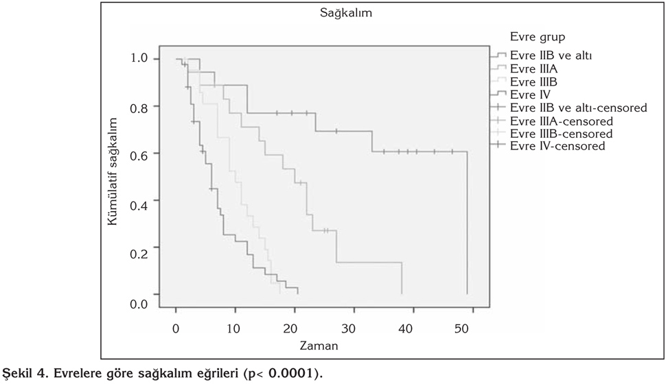 ?al??mam?z?n ikinci aya?? da; KHDAK'l? hastalarda di?er prognostik fakt?rleri belirlemeye ?al??makt?. Akci?er kanserinde prognoza etki eden en ?nemli ?? temel fakt?r?n t?m?r?n alt tipi, evresi ve performans durumu oldu?u d???n?lmektedir (22). "International Association for the Study of Lung Cancer (IASLC)"?n yeni evreleme sistemine g?re KHDAK'li medyan sa?kal?m s?releri; evre IA'da 60 ay, IB'de 43 ay, IIA'da 34 ay, IIB'de 18 ay, IIIA'da 14 ay, IIIB'de 10 ay ve evre IV'te 6 ayd?r. KHDAK prognozunda evre ?nemli bir g?stergedir (23). Bu ?al??mada evre artt?k?a ortalama sa?kal?m k?salmakta olup, sa?kal?m s?releri literat?rle benzerlik g?stermektedir.