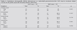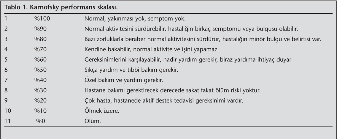 Sa?kal?m s?resi; tan? ald??? tarih ile telefonla yak?nlar?ndan ??renilen ?l?m tarihi veya hasta ?lmemi?se klini?imize en son ba?vuru tarihi aras?nda ge?en s?re olarak tan?mland?. Her hastada performans durumu Karnofsky performans skalas?yla de?erlendirildi (9) (Tablo 1). Hastalar?n FDG-PET/BT g?r?nt?leri Diyarbak?r B?lge E?itim ve Ara?t?rma Hastanesi, N?kleer T?p Klini?inde mevcut Simens Biograph 6 LSO marka taray?c?yla elde edildi. On iki saatlik a?l?k sonras?, 12-14 mCi F-18 FDG'nin intraven?z enjeksiyonundan bir saat sonra, kafa taban?ndan uyluk ?st kesimine kadar t?m v?cut g?r?nt?leri al?nd?. Transaksiyel, koronal ve sagital planlardaki kesitler farkl? kontrast pencerelerinde incelendi. G?r?n?m olarak anormal oldu?u d???n?len t?m FDG birikimlerinde SUV max hesapland?.