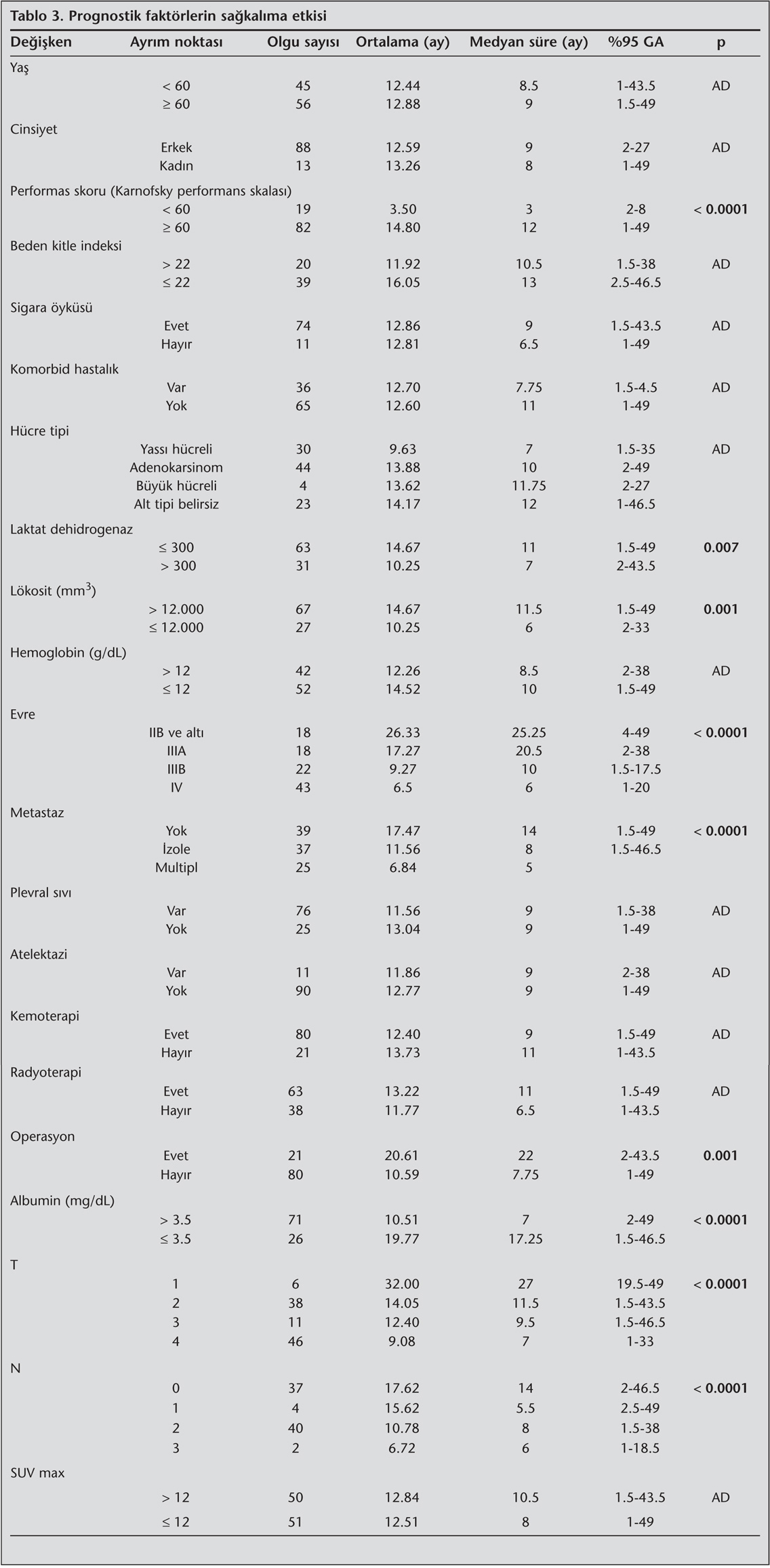 Bulgular: Hastalar?n 88 (%87.1)'i erkek, 13 (%12.9)'? kad?nd?. Ortalama sa?kal?m s?resi 10.6 ? 8.5 (1- 49 ay) ay idi. Hastalar?n demografik, klinik, laboratuvar ve radyolojik parametreleri SUV max'?n medyan de?eri (12.0) ile iki gruba ayr?larak kar??la?t?r?ld?. ?ki grup aras?nda sa?kal?m a??s?ndan, anlaml? bir fark yoktu (p= 0.807). ?al??mada, ileri evre, metastaz varl???, y?ksek laktat dehidrogenaz (LDH) d?zeyi, y?ksek l?kosit d?zeyi, kitlenin inoperabl olmas?, d???k albumin d?zeyi ve d???k performans d?zeyinin sa?kal?m? olumsuz etkiledi?i g?r?ld?.