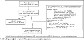 B?lgede her biri yakla??k 2500 eri?kinden sorumlu alt? aile hekimi hizmet vermektedir. ?al??maya her bir aile hekiminin sorumlu oldu?u bireylerden randomize olarak yakla??k 400 ki?i kabul edildi ve 10 haftal?k tarama sonunda 1471'i kad?n, 827'si erkek, 18-92 ya?lar? aras?ndaki (ortalama ya? 50) 2298 kat?l?mc?ya ula??ld?. Kat?l?mc?lara sosyodemografik ve ?z ge?mi?leriyle ilgili bilgileri i?eren sorular (ya?, hastal?k ?yk?s?, ila? kullan?m?) y?neltildi, fizik muayeneleri yap?ld? ve analiz i?in a?l?k kan ?rnekleri al?nd?. KOAH'l? hastalar?n aterosklerotik risk tayinini de?erlendirmek i?in a?a??da belirtilen kriterlere uygun olarak KOAH tan?s? konulan 46 hasta ile ?al??mam?zda KOAH tan?s? konulan en k???k ya? olan 48 ya? ve ?zerindeki 1268 birey aras?ndan hi?bir d??lama kriterini ta??mayan bireyler aras?ndan randomizasyon ile se?ilen 47 sa?l?kl? birey de?erlendirildi (?ekil 1).
