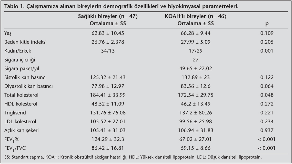 KOAH'l? hastalarla sa?l?kl? bireylerin sistolik ve diyastolik kan bas?n?lar? aras?nda anlaml? farkl?l?k izlenmedi. Total kolesterol d???ndaki lipid parametreleri ve a?l?k kan ?ekeri de?erlerinde KOAH ve sa?l?kl? eri?kin bireyler aras?nda anlaml? farkl?l?k izlenmedi (p> 0.05).