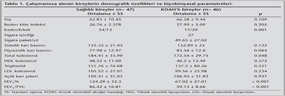 Melen ?al??mas?na ba?vuran 2298 birey aras?nda 46 KOAH tan?l? hasta ve d??lama kriterlerini ta??mayan 47 sa?l?kl? birey ?al??maya dahil edildi. ?al??maya al?nan bireyler 48-84 ya?lar? aras?nda olan 51 kad?n ve 42 erkekti. KOAH tan?l? hastalar?n ya? ortalamas? 66.28 ? 9.44 y?l iken, sa?l?kl? bireylerin ya? ortalamas? 62.83 ? 10.45 y?l idi (p= 0.109). ?al??mam?za al?nan bireylerin BK?'leri de s?ras?yla 27.99 ? 5.09 kg/m2 ve 26.76 ? 2.378 kg/m2 idi (p= 0.205).
