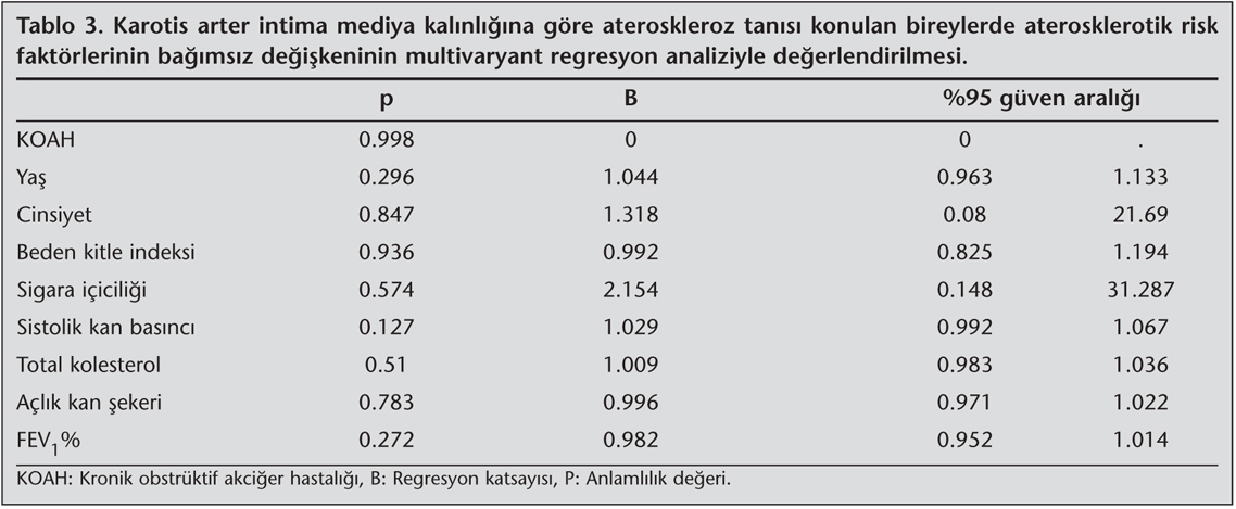 K?MK'yi etkileyen aterosklerotik parametrenin tayini i?in yap?lan ?oklu lineer regresyon analizinde K?MK'nin ya? ile anlaml? bir ?ekilde do?ru orant?l? (p= 0.002), FEV1% ile de anlaml? bir ?ekilde ters orant?l? (p= 0.04) oldu?u saptand? (Tablo 2).