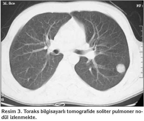 Yirmi ya??nda erkek hastan?n, alt? ayd?r halsizlik ve ?? ayd?r sol yan a?r?s? yak?nmalar? vard?. Askerlik g?revini yapmakta iken Verem Sava? Dispanseri taraf?ndan yap?lan taramada ?ekilen PA akci?er grafisinde ku?kulu lezyon saptanmas? ?zerine hastanemize sevk edildi. Fizik muayene bulgular? normal saptand?; hastan?n ate?i; 36?C, nabz?; 63 vuru/dakika, TA; 100/65 mmHg, solunum say?s?; 16/dakika idi. ?z ge?mi?inde ve yak?n aile anamnezinde bir ?zellik yoktu. Bir paket/y?l sigara ?yk?s? vard?. Tam kan, tam idrar, sedimentasyon ve rutin biyokimya incelemeleri normal s?n?rlarda tespit edildi. PA ve lateral akci?er grafilerinde sol hemitoraksta ?st zonda SPN ile uyumlu g?r?n?m mevcuttu (Resim 1,2). Toraks bilgisayarl? tomografi (BT)'de; sol akci?er ?st lob apikoposterior segmentte, periferik yerle?imli, yakla??k 2 x 2 cm ?ap?nda, d?zg?n kont?rl?, sferik SPN ile uyumlu g?r?n?m saptand?. Mediastende patolojik boyutlarda lenfadenopati yoktu ve tan?mlanan g?r?n?m haricinde infiltrasyon ve kitle saptanmad? (Resim 3). Hasta balgam ??karamad??? i?in al?nan mide suyu asido-alkalo rezistan basil (ARB) negatif olarak de?erlendirildi ve k?lt?r?nde ?reme olmad?. Bronkoskopide endobron?iyal lezyon g?zlenmedi. Bron? lavaj? ARB negatifti ve k?lt?r?nde ?reme olmad?. Bron? lavaj? sitolojik incelemesi malignite y?n?nden negatif olarak raporland?. Kist hidatik i?in yap?lan ELISA testi negatif bulundu. Bat?n ultrasonografi (USG) incelemesi normaldi. Olgudan SPN etyolojisini ayd?nlatabilmek i?in g???s cerrahisi kons?ltasyonu al?nd? ve olguya kist hidatik ?n tan?s?yla operasyon planland?. Torakotomi ile sol ?st lobda saptanan 2 x 2 cm'lik nod?le wedge rezeksiyon uyguland? ve perioperatif patoloji kons?ltasyonu istendi. Elde edilen materyalin makroskobik incelenmesinde malignite saptanmamas? ?zerine operasyon sonland?r?ld?. Eksizyonel biyopsi ?rne?inin mikroskobik incelemesi intralober pulmoner sekestrasyon (Kesitlerde akci?er parankimi bulgular? g?steren iyi s?n?rl? nod?ler lezyon izlenmektedir. G?m??leme y?ntemiyle yap?lan incelemede lezyonda yayg?n olarak retik?lin liflerinde art??, baz?lar? hiperplastik g?r?n?mde damar yap?lar? ve d?zensiz bron? alveol ?at?lar? g?r?lmektedir) olarak raporlanm??t?r.