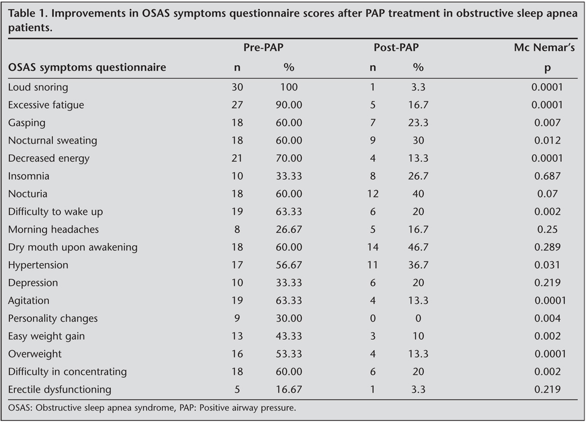 Mean body mass index (BMI) of the patients was 33.13 ? 7.78 kg/m2. There was no statistical difference between the mean body weight of the patients before and after the PAP therapy (p= 0.202). There was a decline in daytime sleepiness and, a statistically significant difference was found in mean ESS score after PAP therapy (10.07 ? 5.92 vs. 6.28 ? 3.58; p= 0.0001). There were statistically significant decreases in the scores of OSAS symptoms questionnaire after PAP therapy (Table 1). Loud snoring (100%) and excessive fatigue (90%) were the mostly encountered symptoms. When asked after PAP therapy; dry mouth (46.7%) and nocturia (40%) were the primary complaints.