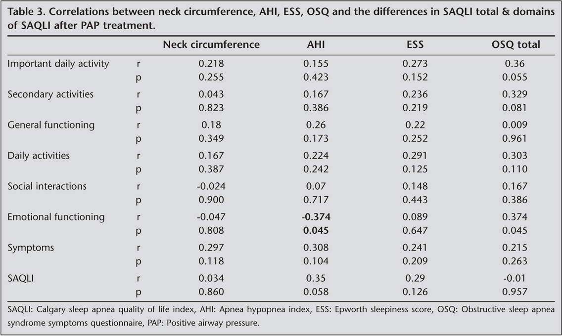 Differences in SAQLI total score and also in domains of SAQLI score related to PAP therapy were calculated. Correlations between the differences of these scores and; neck circumference, AHI, ESS score, OSAS symptoms questionnaire score were evaluated. A negative statistically significant relation between "AHI difference" and "emotional functioning difference" related to PAP therapy was found (r= -0.374, p= 0.045). There were not any statistical significant results in other parameters (p> 0.05) (Table 3).