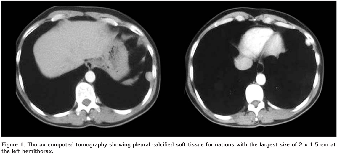 Calcifying fibrous tumors are generally solitary lesions. Their etiology or pathogenesis has not been defined. The complaint upon presentation is usually nonspecific pain. The lesions are unencapsulated and originate from parietal or visceral pleura (2,5,10). In the literature, we could find 11 reported cases of CTP. With respect to number of the nodules, distribution of these cases was described as 4 multiple, 4 solitary, 2 disseminated and 1 bilateral lesions (1,2,3,4,5,11,12,13). In our case, CTP was in the form of multiple lesions located in the left hemithorax and treated with total decortication.