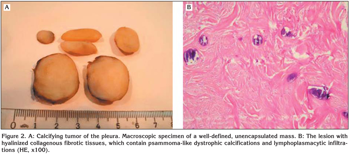 Video-assisted thoracoscopic surgery (VATS) was performed for monitoring the pleural lesions. Thoracoscopic examination demonstrated two well-defined pleural lesions on the lateral wall of the left hemithorax and extensive pleural adhessions. A biopsy specimen was obtained and sent for the frozen section examination. The frozen section revealed a benign/calcifying tumor. In order to achive an exact diagnosis, curative treatment, and presence of pleural adhessions, left thoracotomy was performed instead of VATS. The left hemi-thorax could be visualized via left thoracotomy incision through the 5th intercostal space. In the detailed examination, four lesions of pleural origin were detected. Each lesions were removed by pleural decortication. No lesion was palpated in the lung paranchyme. Macroscopical evaluation revealed 4 well-defined, unencapsulated masses, the largest of which was nearly 2.2 x 1.5 x 1 cm in diameter (Figure 2A). Histopathological examination of all these lesions were revealed the diagnosis of "CTP" with psammomatous calcifications and lymphohistiocytic inflammatory cell infiltrations in hyalinized collogenous fibrotic tissue (Figure 2B). In the immunohistochemical staining, the fibrous tissue was positive for vimentin and inflammatory cells were positive for CD45 and CD68. However, it was stained negative for actin, desmin, S100 protein, CD31, and CD34. Also, no positive staining was determined in the controlled histochemical staining for amiloid. All chest tubes of the patient were removed at the postoperative 1st and 3rd days. No complications were observed, and the patient was discharged at the end of the postoperative 1st week.