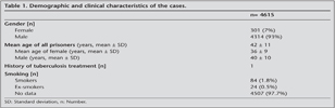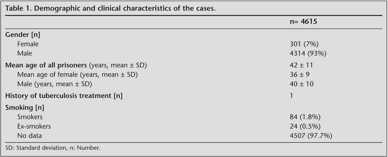 During the study period, a total of 4615 prisoners in 10 prisons, 301 (7%) female and 4314 (93%) male, were screened by microfilm. The mean age of all prisoners was 42 ? 11 years. The mean age of female and male prisoners were 36 ? 9 and 40 ? 10 years. 398/4615 (8.6%) were young adults inmates with an age range of 14-18 years. The demographic and clinical characteristics of the inmates are shown in Table 1.