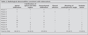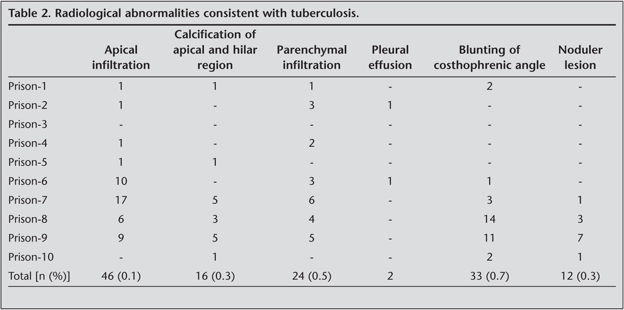 Patients and Methods: All the inmates in ten prisons mostly located in the four cities in the Marmara Region of Turkey were enrolled in this study. Tuberculosis screening was done between January 2006-January 2007. Radiological screening for tuberculosis was performed by the mobile X-ray system and it was followed by bacteriological analysis of sputum for tuberculosis suspects. Four physicians evaluated the X-rays independently.