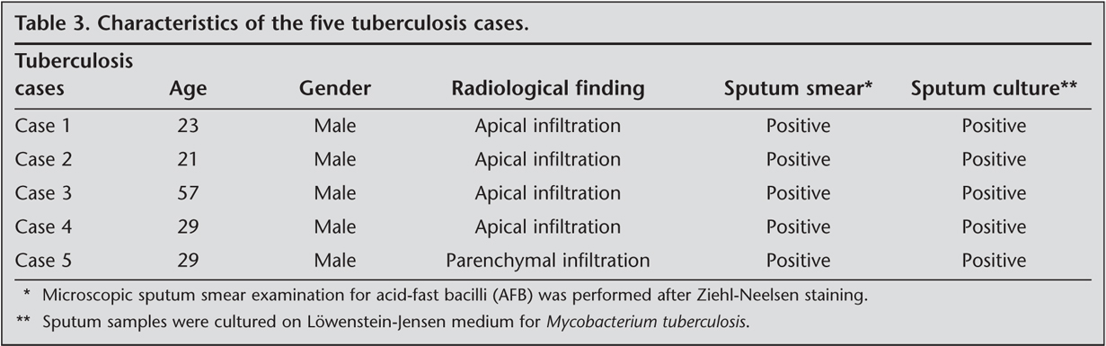 Between January 2006-January 2007 all the inmates in 10 prisons mostly located in the four cities in the Marmara Region of Turkey were enrolled in this study. Each inmate was interviewed using a standardised questionnaire containing questions on demographic, clinical variables [including cough (> 3 weeks), sputum, fever, weakness, weight loss, loss of appetite, night sweats], history of tuberculosis treatment and smoking habits. Each inmate underwent for microfilm examination that is used in community based screening for tuberculosis by the mobile X-ray system in Turkey. All microfilms were evaluated by three physicians (two chest physicians, one dispensary physician) who were blinded to the subjects' sign and symptoms. Radiologically suspected tuberculosis lesions on microfilms were selected for standart posterior-anterior chest X-rays. Agreement were settled by concensus between the two specialists. Inmates with any pulmonary, mediastinal or pleural abnormality in standart posterior-anterior chest X-rays were selected for sputum examination. Three early morning sputum samples were collected from tuberculosis suspects on different days. Microscopic sputum smear examination for acid-fast bacilli (AFB) was performed after Ziehl-Neelsen staining. All sputum samples were cultured on L?wenstein-Jensen medium.