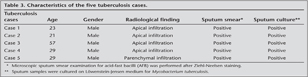 Smear and culture positive pulmonary tuberculosis diagnosed in 5 out of 130 , were all male with mean age 33 ? 10 years (Table 3).